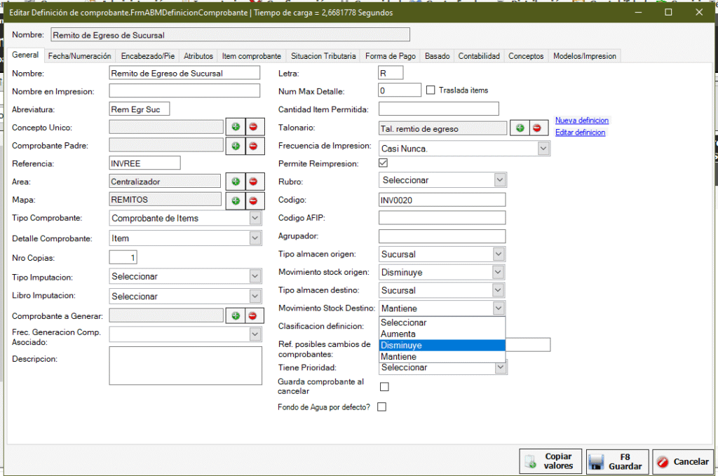 En el campo Movimiento Stock Destino seleccionamos Disminuye y le damos a Guardar