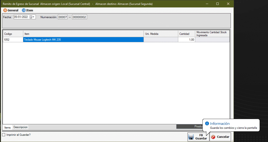 Luego de seleccionarlo con doble click volvemos a la pantalla anterior, modificamos la cantidad y le damos a Guardar