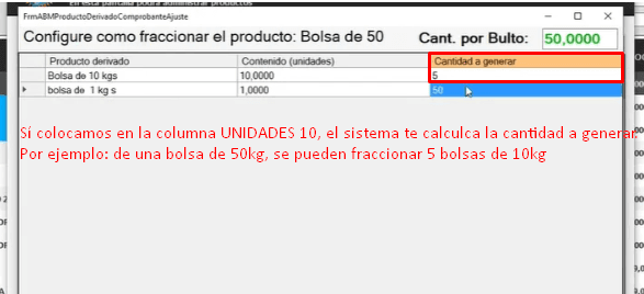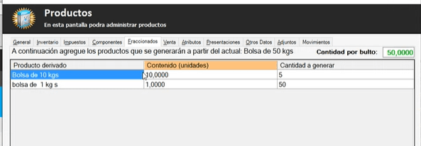 En el caso del módulo FRACCIONADO, se usa para saber cuanto stock tiene en las presentaciones, como por ejemplo, lo que fraccionamos en bolsa de 10kg