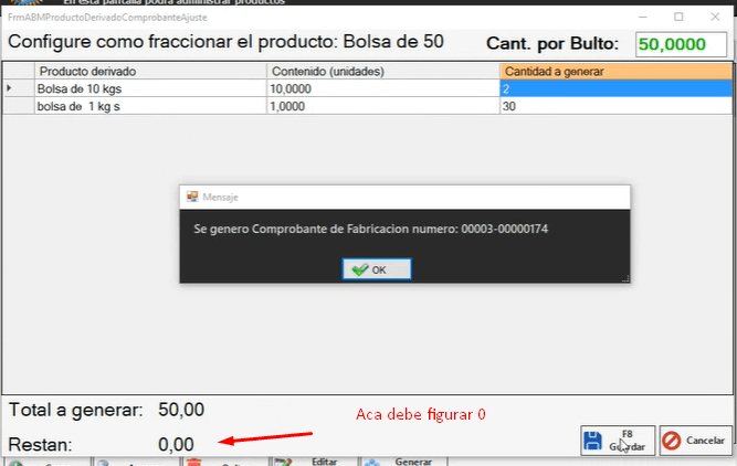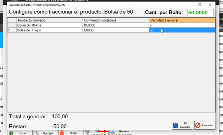 Desde la solapa «fraccionados» podemos armar el producto derivado, por ejemplo: