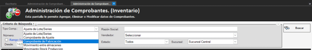 - Inventario – Consultar comprobantes de inventario, y seleccionamos «comprobante de fabricación» para ver los comprobantes generados