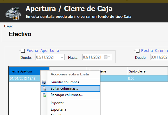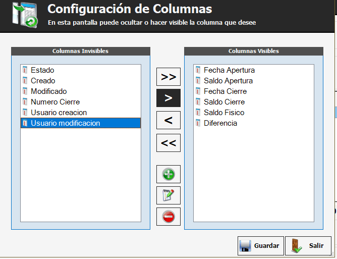 Primero debemos ir a Tesorería -> Caja -> Apertura / Cierre de CajasSeleccionamos la caja a editar y pinchamos el botón «Siguiente»En la nueva pantalla que se abre debemos hacer click derecho en la cabecera de la grilla y seleccionar la opción «Editar columnas»Seleccionar el ítem «Usuario modificación» y pasarlo a la columna de la derecha con el botón «>». Al terminar presionar el botón «Guardar»Listo, se verá de esta forma, en este caso quedó en el último campo de la grilla